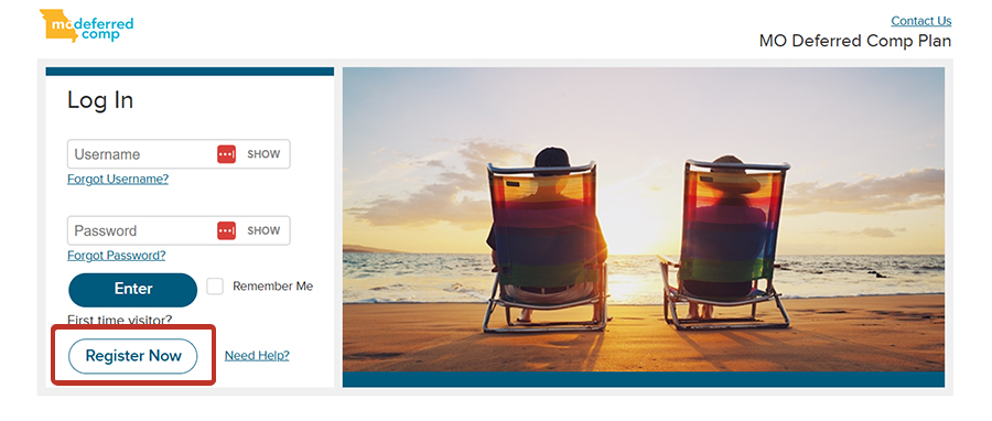 - Visit www.modeferredcomp.org, click the Log In button at the top of the website, and choose the Register Now button on the following page.